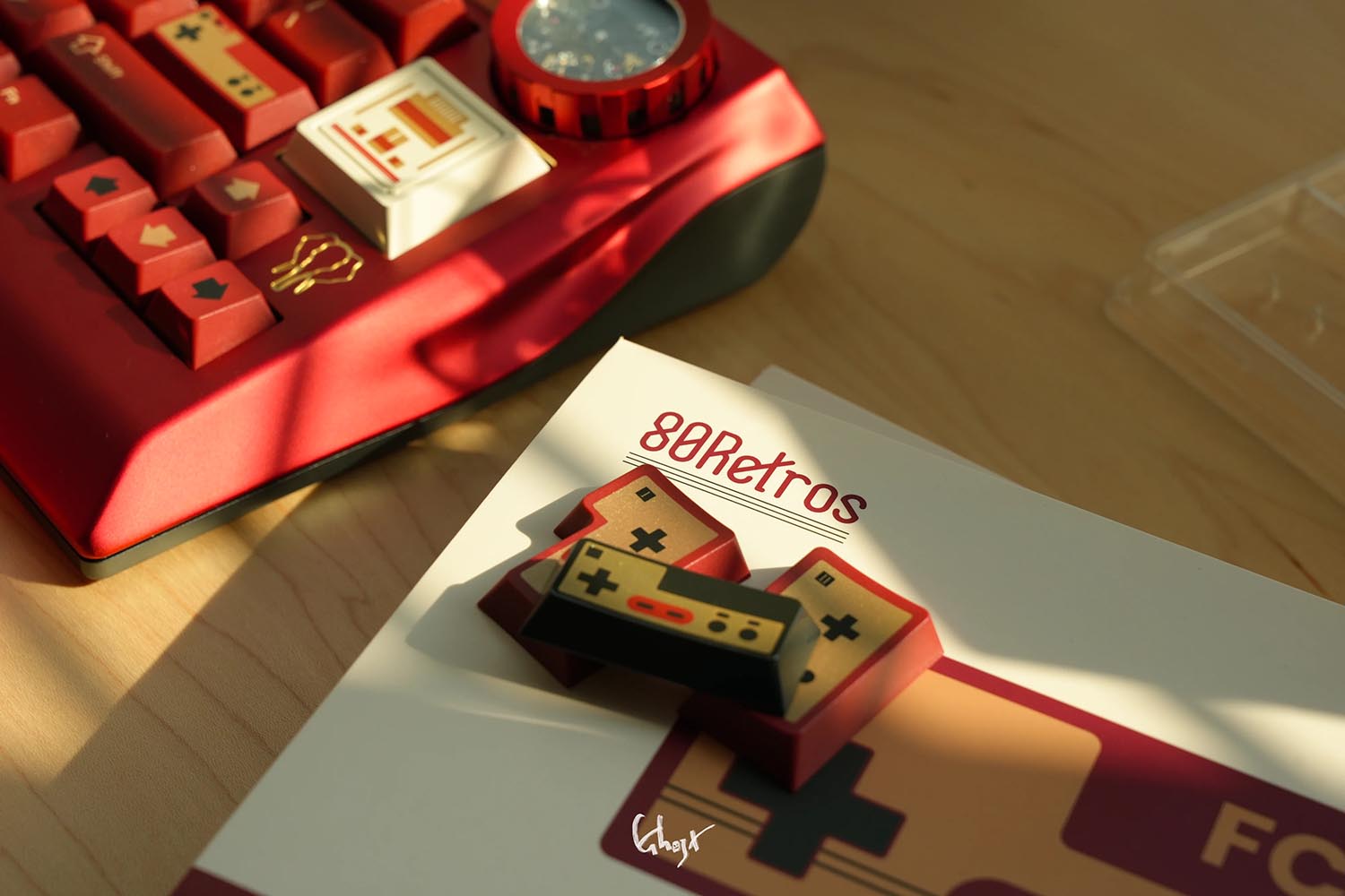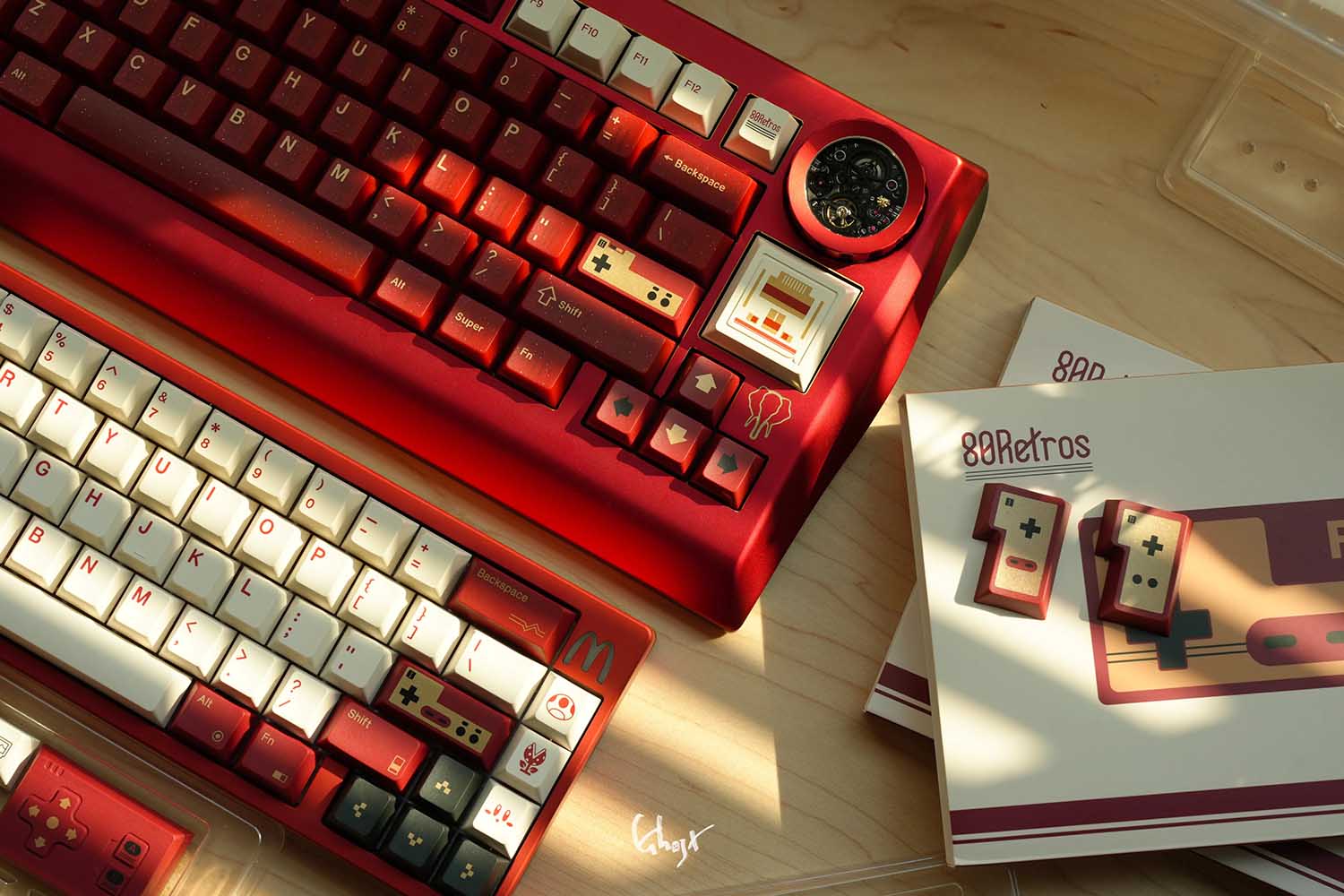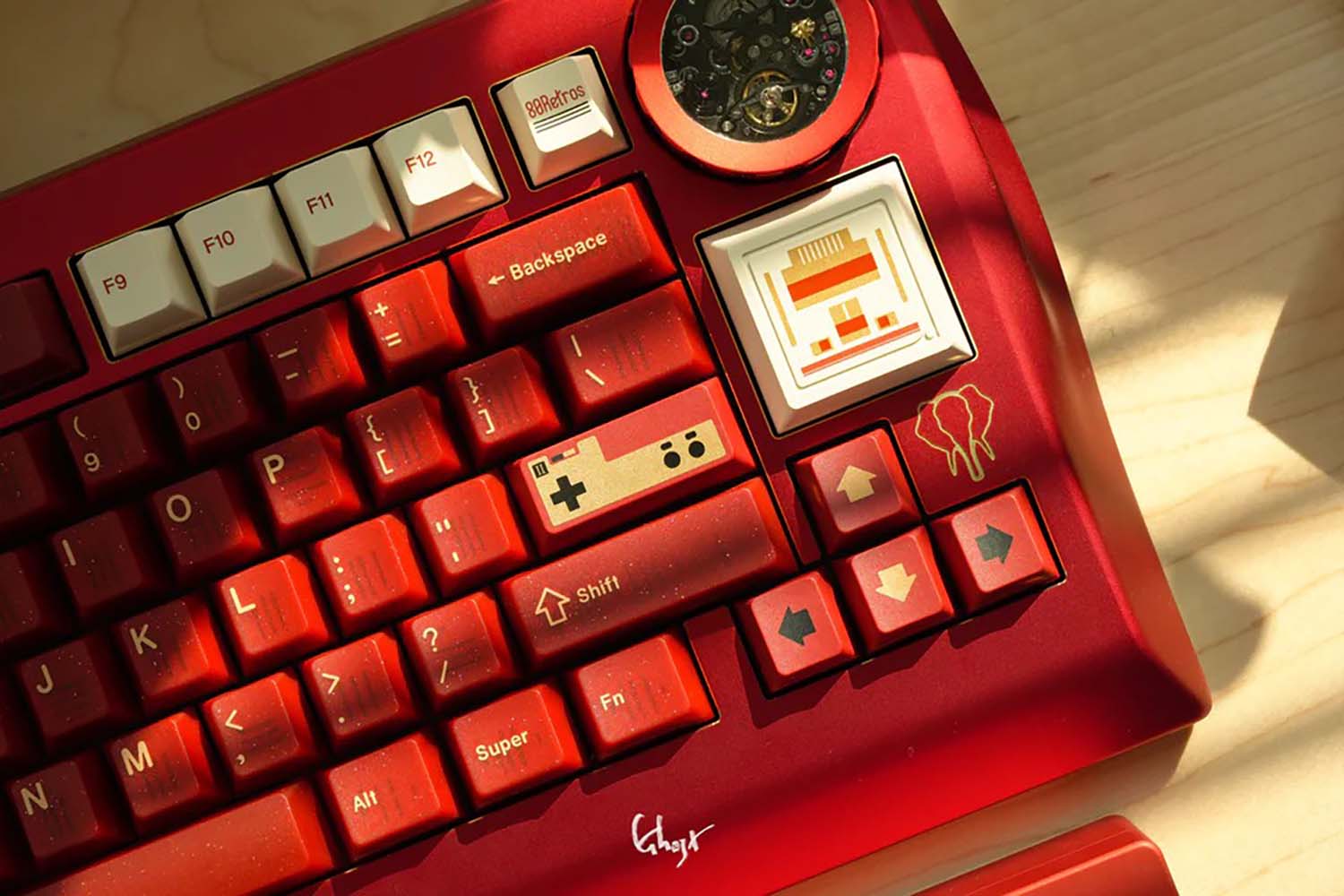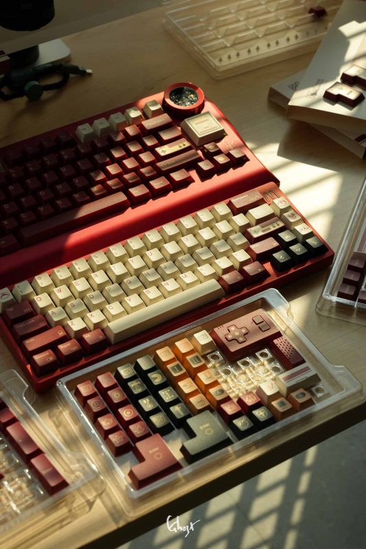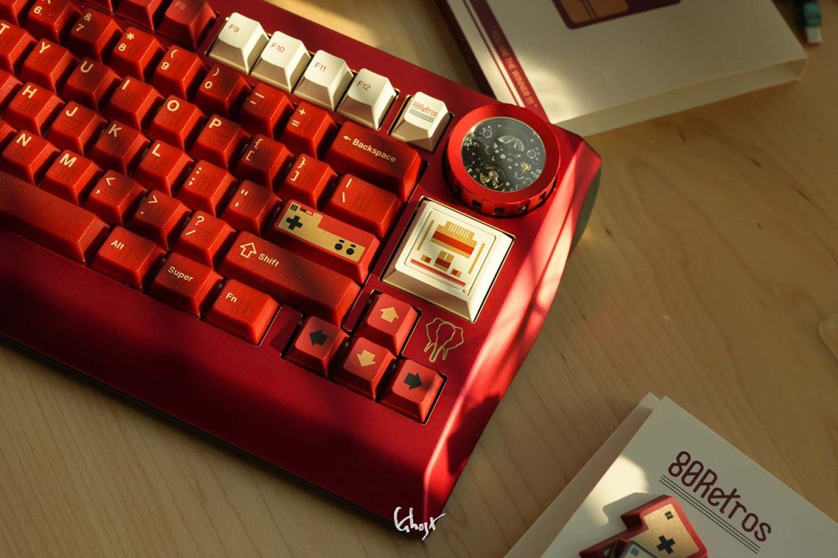 Các phím bấm được làm từ chất liệu PBT. Để đạt được hiệu ứng “vàng” trong phối màu đỏ và vàng, 80Retros đã sử dụng lại kỹ thuật in mực (Ink-Printing) kết hợp với xử lý nhiệt độ cao, đây chính là cốt lõi của thiết kế này – chủ đề đỏ và vàng. Việc sử dụng mực vàng không chỉ làm tăng thêm vẻ đẹp tổng thể mà còn mang lại chiều sâu thị giác khác biệt so với các phối màu thông thường.