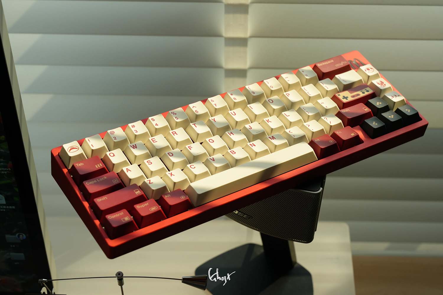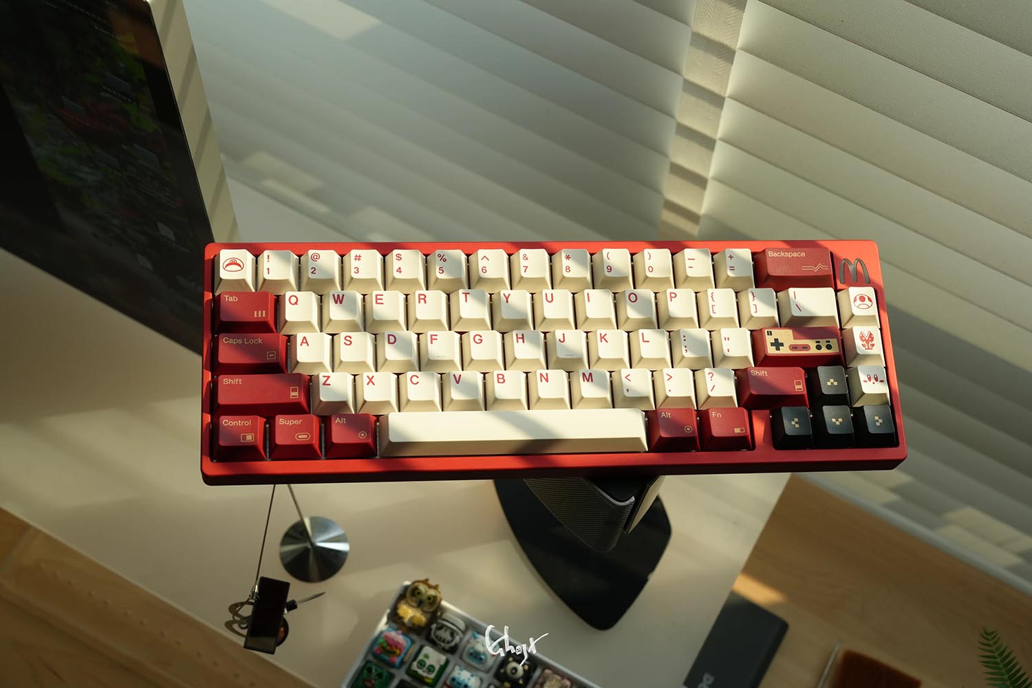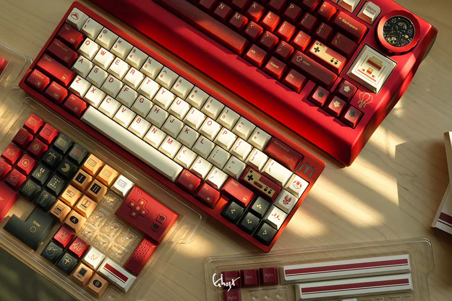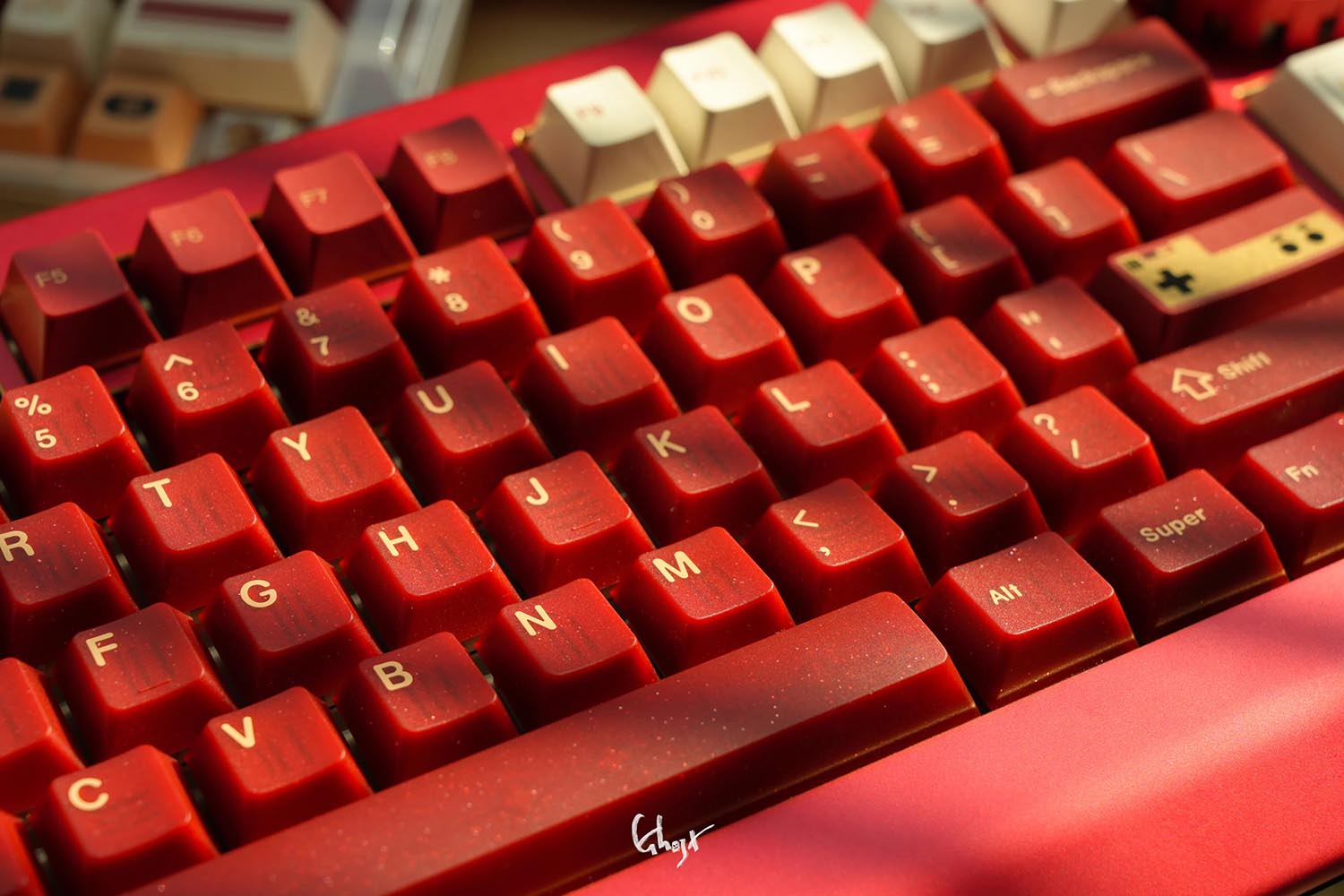 Các phím bấm được làm từ chất liệu PBT. Để đạt được hiệu ứng “vàng” trong phối màu đỏ và vàng, 80Retros đã sử dụng lại kỹ thuật in mực (Ink-Printing) kết hợp với xử lý nhiệt độ cao, đây chính là cốt lõi của thiết kế này – chủ đề đỏ và vàng. Việc sử dụng mực vàng không chỉ làm tăng thêm vẻ đẹp tổng thể mà còn mang lại chiều sâu thị giác khác biệt so với các phối màu thông thường.